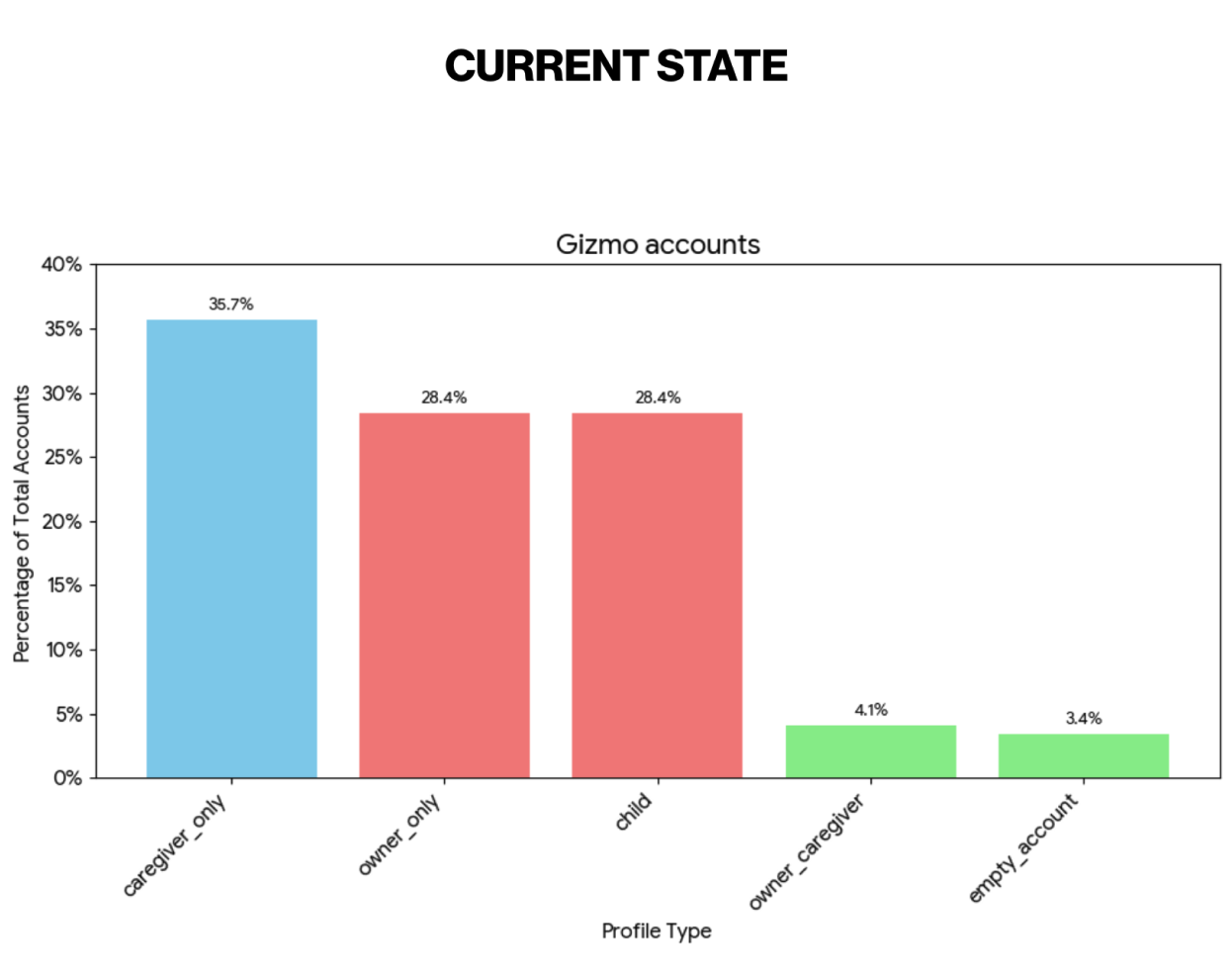 Caregivers make up over 36% of Gizmo accounts, followed by 29% being owners.