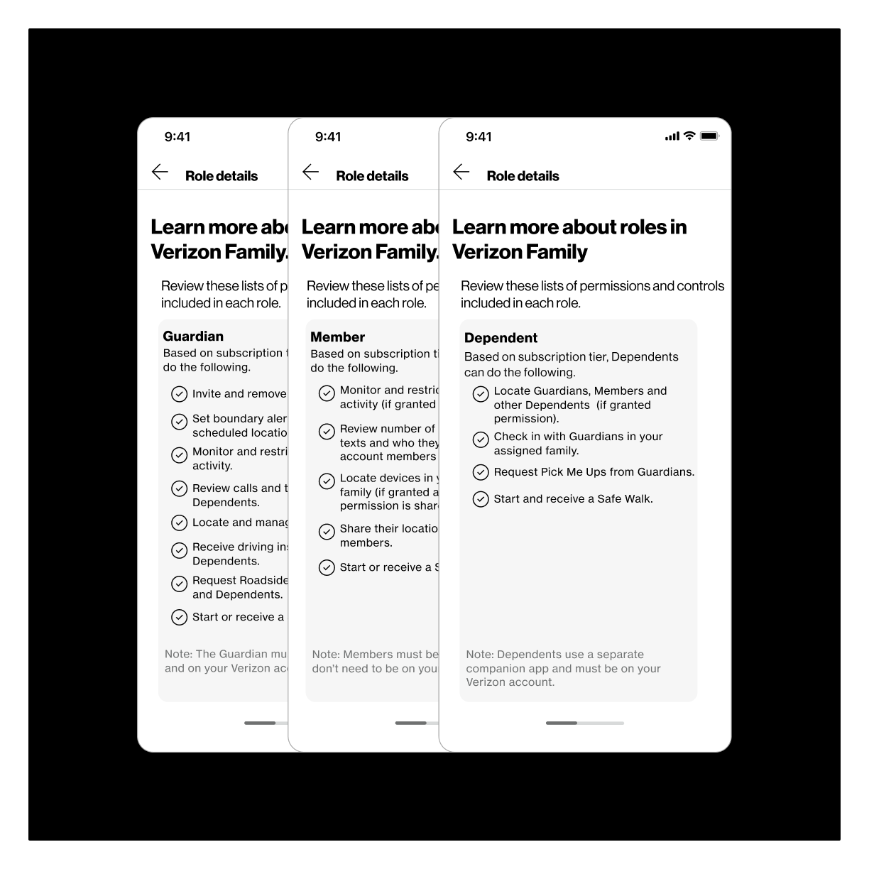 I led the design work end to end, partnering closely with a senior designer, Product, Engineering, and UX Research. Early in the project, I audited the existing Verizon Family experience to understand current flows, system constraints, and technical limitations.