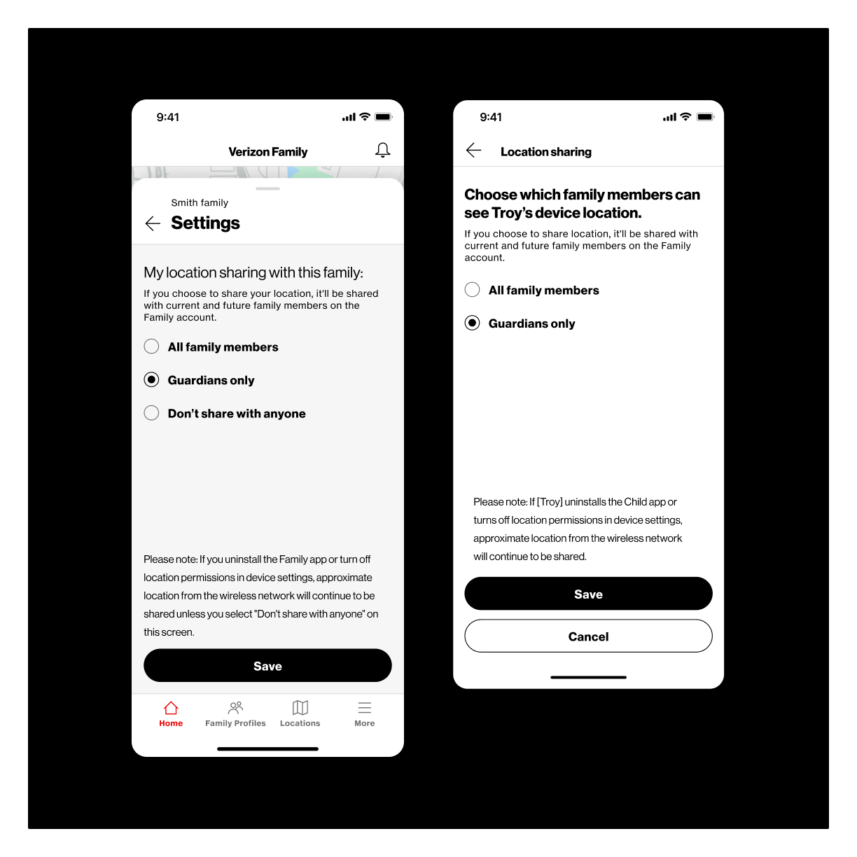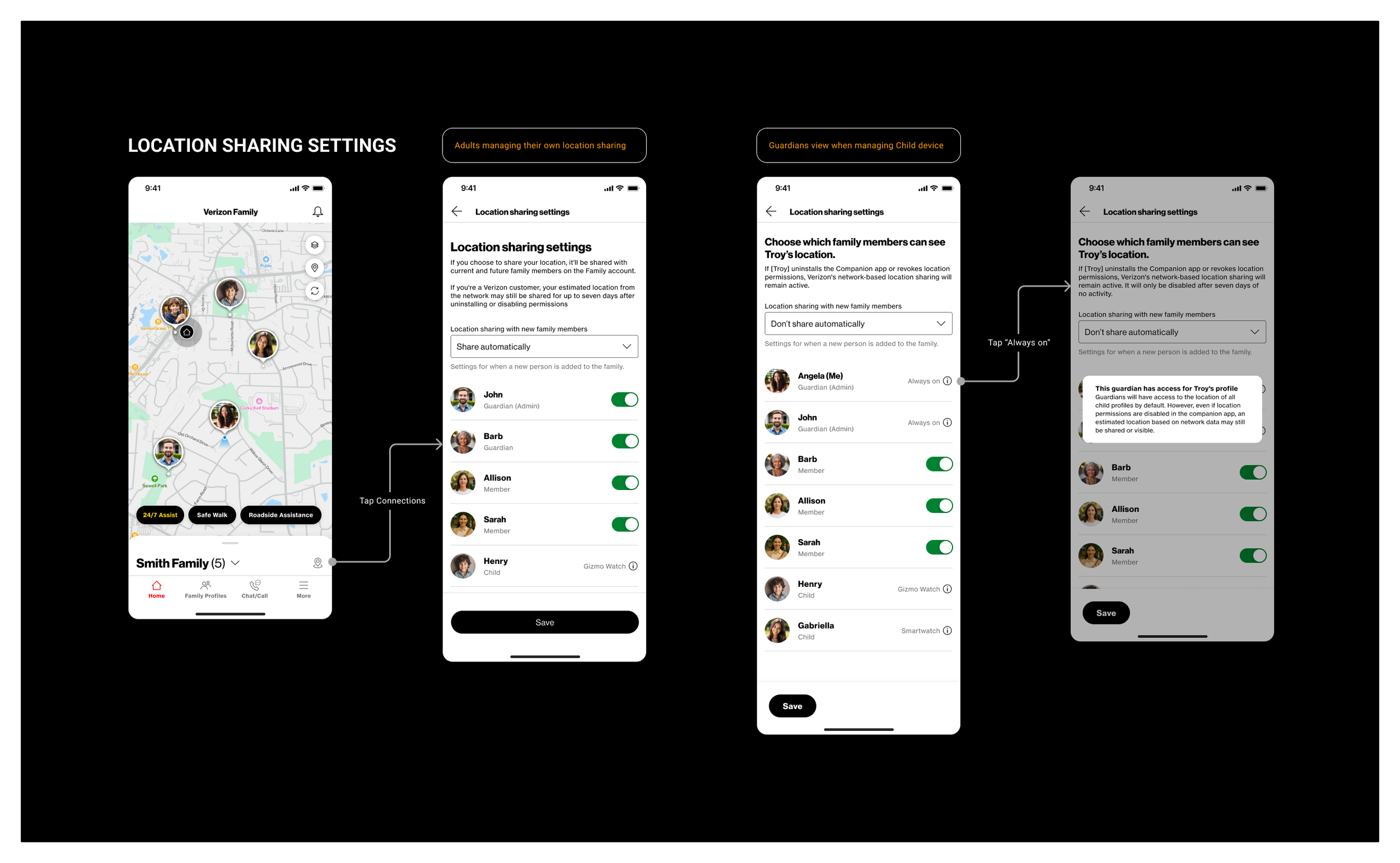 The original location sharing settings gave users three broad options: share with the whole family, share with guardians only, or don't share at all. There was no way to choose specific people, and for child devices, guardians controlled everything with no option to turn sharing off. It was rigid and didn't account for the nuance families actually need.