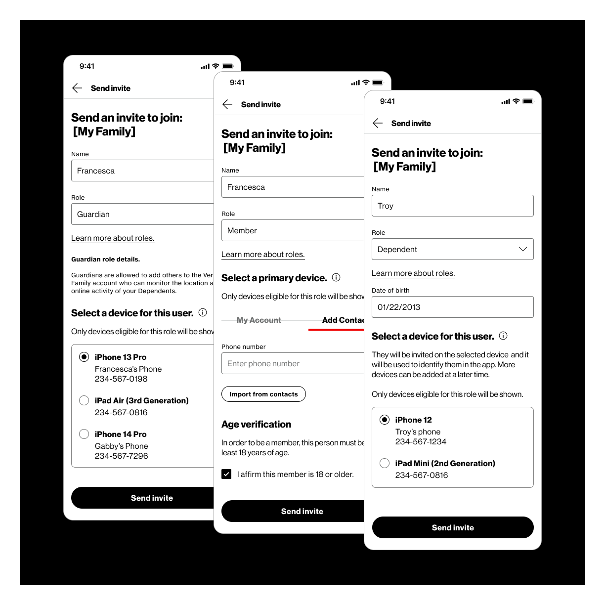 A platform level redesign of how people are invited, assigned permissions, and managed across Verizon Family and the new Gizmo Watch integration.